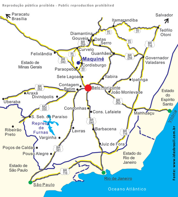 Para quem sai de São Paulo o caminho mais prático é pela BR381 (Rodovia Fernão Dias) até Belo Horizonte. Desta cidade, seguir as intruções em negrito acima.