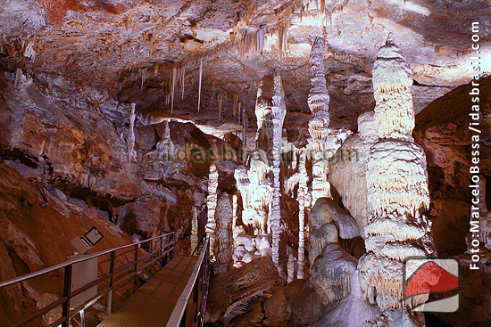que se divisam em seu interior: o Salão do Urso, com enorme massa de estalactites; no